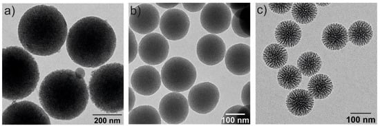 Among the mesoporous silica systems, MSNs offer outstanding advantages over non-porous silica nanoparticles, such as large pore volume (0.6–1.5 cm3/g), high surface area (700–1000 m2/g), tunable particle sizes, tailorable pore diameter (2–10 nm), high thermal, chemical and biological stabilities, ease of functionalization, biodegradability and good biocompatibility [40,41]. MSNs have a high rate of mass transport, a high affinity for substrates and a high dispersibility in solutions [42]. Additionally, they have two functional surfaces, the inner one, which corresponds to the pore channels and the external surface, which is highly susceptible to be selectively functionalized [43]. The particle size, pore diameter and characteristics of the silica NPs depend on the synthesis conditions [44]. Some examples of silica NPs, analyzed by transmission electron microscopy, are illustrated in Figure 3.