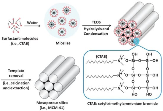 Schematic representation of the mechanism of formation of MCM-41 using cetyltrimethylammonium bromide (CTAB) as cationic surfactant [48]. Copyright © 2022, Royal Society of Chemistry.