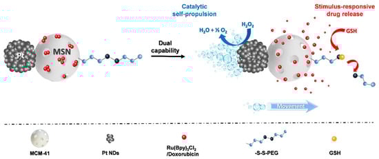 - Díez, P.; Lucena-Sánchez, E.; Escudero, A.; Llopis-Lorente, A.; Villalonga, R.; Martínez-Máñez, R. Ultrafast Directional Janus Pt–Mesoporous Silica Nanomotors for Smart Drug Delivery. ACS Nano 2021, 15, 4467–4480. [Google Scholar] [CrossRef] [PubMed]
