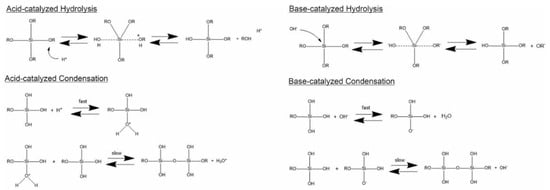 Hydrolysis and condensation in acidic and basic conditions. Adapted from [26]. Copyright © 2022, American Chemical Society.