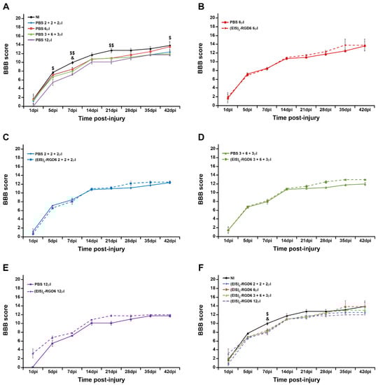 Determination of the injection system: 21-point Basso, Beattie, and Bresnahan open-field test (BBB) score. Graphs show data obtained from the motor functional recovery analysis using the BBB score in the experimental set performed to determine the best (EIS)2-RGD6 injection system [experiment (EIS)2-RGD6 I]. The BBB score was assessed at 1, 5, 7, 14, 21, 28, 35, and 42 days post-injury (dpi). The following comparisons are shown: (A) Non-injected (NI) group vs. PBS-injected groups (PBS 6 µL, PBS 2 + 2 + 2 µL, PBS 3 + 6 + 3 µL, or PBS 12 µL) (&, p < 0.05 NI vs. PBS 3 + 6 + 3 µL; $, p < 0.05 and $$, p < 0.01 NI vs. PBS 12 µL); (B) PBS 6 µL group vs. (EIS)2-RGD6 6 µL group; (C) PBS 2 + 2 + 2 µL group vs. (EIS)2-RGD6 2 + 2 + 2 µL group; (D) PBS 3 + 6 + 3 µL group vs. (EIS)2-RGD6 3 + 6 + 3 µL group; (E) PBS 12 µL group vs. (EIS)2-RGD6 12 µL group; and (F) NI group vs. (EIS)2-RGD6-injected groups [(EIS)2-RGD6 6 µL, (EIS)2-RGD6 2 + 2 + 2 µL, (EIS)2-RGD6 3 + 6 + 3 µL or (EIS)2-RGD6 12 µL] [&, p < 0.05 NI vs. (EIS)2-RGD6 3 + 6 + 3 µL; $, p < 0.05 NI vs. (EIS)2-RGD6 12 µL]. In (A–F), the potential existence of statistically significant between-group differences was assessed by two-way ANOVA followed by the Bonferroni post-hoc test. Please note that data obtained from the separate analysis of the individual BBB parameters evaluated can be found in Table S1.