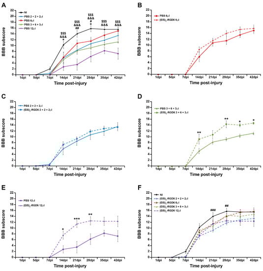 Determination of the injection system: 21-point Basso, Beattie, and Bresnahan open-field test (BBB) sub-score. Graphs show data obtained from the analysis of motor functional recovery using the BBB sub-score in the experimental set performed to determine the best (EIS)2-RGD6 injection system [experiment (EIS)2-RGD6 I]. The BBB sub-score was assessed at 1, 5, 7, 14, 21, 28, 35, and 42 days post-injury (dpi). The following comparisons are shown: (A) Non-injected (NI) group vs. PBS-injected groups (PBS 6 µL, PBS 2 + 2 + 2 µL, PBS 3 + 6 + 3 µL, or PBS 12 µL) (*, p < 0.05 NI vs. PBS 6 µL; #, p 0.05 and ##, p < 0.01 NI vs. PBS 2 + 2 + 2 µL; &&&, p < 0.001 NI vs. PBS 3 + 6 + 3 µL; $$$, p < 0.001 vs. PBS 12 µL); (B) PBS 6 µL group vs. (EIS)2-RGD6 6 µL group; (C) PBS 2 + 2 + 2 µL group vs. (EIS)2-RGD6 2 + 2 + 2 µL group; (D) PBS 3 + 6 + 3 µL group vs. (EIS)2-RGD6 3 + 6 + 3 µL group [*, p < 0.05 and **, p < 0.01 PBS 3 + 6 + 3 µL vs. (EIS)2-RGD6 3 + 6 + 3 µL]; (E) PBS 12 µL group vs. (EIS)2-RGD6 12 µL group (*, p < 0.05; **, p < 0.01 and ***, p < 0.001 PBS 12 µL vs. (EIS)2-RGD6 12 µL); and (F) NI group vs. (EIS)2-RGD6-injected groups [(EIS)2-RGD6 6 µL, (EIS)2-RGD6 2 + 2 + 2 µL, (EIS)2-RGD6 3 + 6 + 3 µL, or (EIS)2-RGD6 12 µL] [##, p < 0.01 and ###, p < 0.001 NI vs. (EIS)2-RGD6 2 + 2 + 2 µL]. In (A–F), the potential existence of statistically significant between-group differences was assessed by two-way ANOVA followed by the Bonferroni post-hoc test. Please note that data obtained from the separate analysis of the individual BBB parameters evaluated can be found in Table S1.