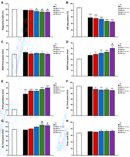 Determination of the injection system: Catwalk®-based gait analysis I. Graphs present data obtained from the evaluation at 42 days post-injury of motor functional recovery using the Catwalk® gait analysis system [non-injected (NI) group vs. PBS-injected groups (PBS 6 µL, PBS 2 + 2 + 2 µL, PBS 3 + 6 + 3 µL, or PBS 12 µL)] in the experimental set performed to determine the best (EIS)2-RGD6 injection system [experiment (EIS)2-RGD6 I]. The following gait parameters were evaluated: (A) regularity index; (B) AB step pattern; (C) front paws base of support (BOS); (D) hind paws BOS; (E) print positions; (F) front paws stride length (SL); (G) hind paws SL; and (H) duty cycle. In (A–H), the potential existence of statistically significant between-group differences was assessed by one-way ANOVA followed by the Bonferroni post-hoc test. In all cases: *, p < 0.05; **, p < 0.01; and *** p < 0.001 vs. pre-injury (PI), while #, p < 0.05 and ##, p < 0.01 vs. NI.