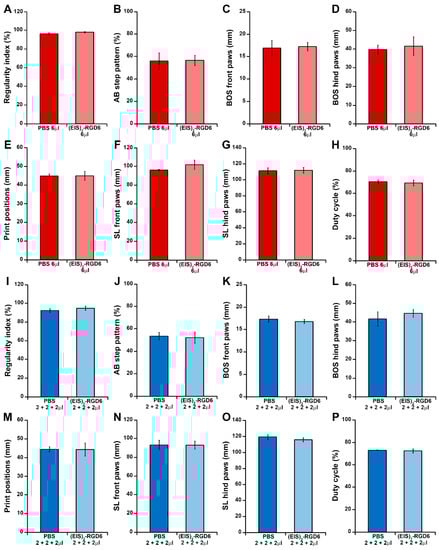 Determination of the injection system: Catwalk®-based gait analysis II. Graphs show data obtained from the evaluation at 42 days post-injury of motor functional recovery using the Catwalk® gait analysis system [PBS 6 µL group vs. (EIS)2-RGD6 6 µL group (A–H) and PBS 2 + 2 + 2 µL group vs. (EIS)2-RGD6 2 + 2 + 2 µL group (I–P)] in the experimental set performed to determine the best (EIS)2-RGD6 injection system [experiment (EIS)2-RGD6 I]. The following gait parameters were evaluated: (A,I) regularity index; (B,J) AB step pattern; (C,K) front paws base of support (BOS); (D,L) hind paws BOS; (E,M) print positions; (F, N) front paws stride length (SL); (G,O) hind paws SL; and (H,P) duty cycle. In (A–P), the potential existence of statistically significant between-group differences was assessed by two-tailed Student’s t-test.