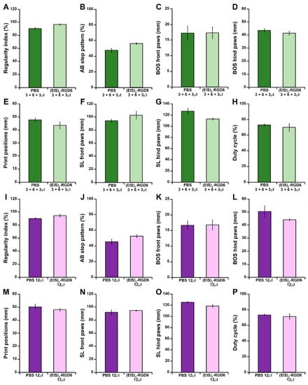Determination of the injection system: Catwalk®-based gait analysis III. Figure showing data obtained from the evaluation at 42 days post-injury of motor functional recovery using the Catwalk® gait analysis system [PBS 3 + 6 + 3 µL group vs. (EIS)2-RGD6 3 + 6 + 3 µL group (A–H) and PBS 12 µL group vs. (EIS)2-RGD6 12 µL group (I–P)] in the experimental set performed to determine the best (EIS)2-RGD6 injection system [experiment (EIS)2-RGD6 I]. The following gait parameters were evaluated: (A,I) regularity index; (B,J) AB step pattern; (C,K) front paws base of support (BOS); (D,L) hind paws BOS; (E,M) print positions; (F,N) front paws stride length (SL); (G,O) hind paws SL; and (H,P) duty cycle. In (A–P), the potential existence of statistically significant between-group differences was assessed by two-tailed Student’s t-test.