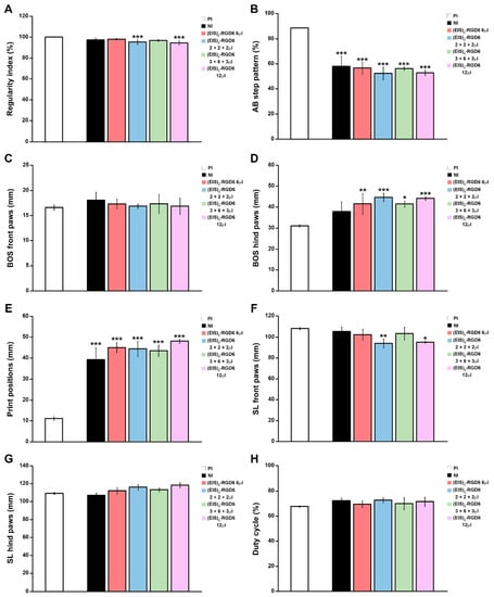 Determination of the injection system: Catwalk®-based gait analysis IV. Graphs show data obtained from the evaluation at 42 days post-injury of motor functional recovery using the Catwalk® gait analysis system [NI group vs. (EIS)2-RGD6-injected groups [(EIS)2-RGD6 6 µL, (EIS)2-RGD6 2 + 2 + 2 µL, (EIS)2-RGD6 3 + 6 + 3 µL, or (EIS)2-RGD6 12 µL)] in the experimental set performed to determine the best (EIS)2-RGD6 injection system [experiment (EIS)2-RGD6 I]. The following gait parameters were evaluated: (A) regularity index; (B) AB step pattern; (C) front paws base of support (BOS); (D) hind paws BOS; (E) print position; (F) front paws stride length (SL); (G) hind paws SL; and (H), duty cycle. In (A–H), the potential existence of statistically significant between-group differences was assessed by one-way ANOVA followed by the Bonferroni post-hoc test. In all cases: *, p < 0.05; **, p < 0.01; and ***, p < 0.001 vs. pre-injury (PI).