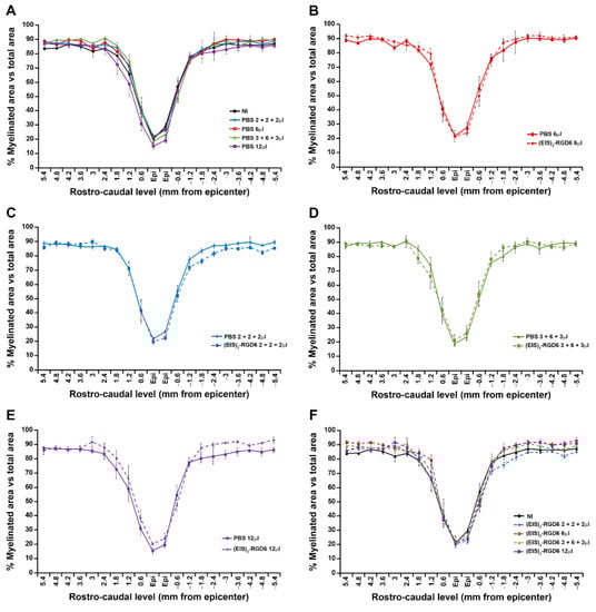 Determination of the injection system: Myelin preservation. Graphs show data obtained from the densitometrical analysis at 42 days post-injury of myelin preservation in eriochrome cyanine-stained sections from the experimental set performed to determine the best (EIS)2-RGD6 injection system [experiment (EIS)2-RGD6 I]. The following comparisons are shown: (A) Non-injected (NI) group vs. PBS-injected groups (PBS 6 µL, PBS 2 + 2 + 2 µL, PBS 3 + 6 + 3 µL, or PBS 12 µL); (B) PBS 6 µL group vs. (EIS)2-RGD6 6 µL group; (C) PBS 2 + 2 + 2 µL group vs. (EIS)2-RGD6 2 + 2 + 2 µL group; (D) PBS 3 + 6 + 3 µL group vs. (EIS)2-RGD6 3 + 6 + 3 µL group; (E) PBS 12 µL group vs. (EIS)2-RGD6 12 µL group; and (F) NI group vs. (EIS)2-RGD6-injected groups [(EIS)2-RGD6 6 µL, (EIS)2-RGD6 2 + 2 + 2 µL, (EIS)2-RGD6 3 + 6 + 3 µL, or (EIS)2-RGD6 12 µL]. In (A–F), the potential existence of statistically significant between-group differences was assessed by two-way ANOVA followed by the Bonferroni post-hoc test. Please note that representative images from Ecy stained sections corresponding to each evaluated group can be found in Figure S1.