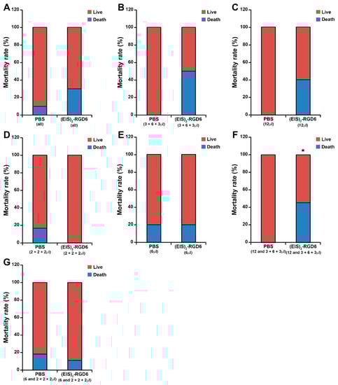 Determination of the injection system: Mortality rate. Graphs show data obtained from the evaluation of mortality rate in animals from the experimental set performed to determine the best (EIS)2-RGD6 injection system [experiment (EIS)2-RGD6 I]. The following comparisons were performed: (A) All PBS-injected animals (PBS 6 µL, PBS 2 + 2 + 2 µL, PBS 3 + 6 + 3 µL, and PBS 12 µL groups) vs. all (EIS)2-RGD6-injected animals [(EIS)2-RGD6 6 µL, (EIS)2-RGD6 2 + 2 + 2 µL, (EIS)2-RGD6 3 + 6 + 3 µL, and (EIS)2-RGD6 12 µL]; (B) PBS 3 + 6 + 3 µL group vs. (EIS)2-RGD6 3 + 6 + 3 µL group; (C) PBS 12 µL group vs. (EIS)2-RGD6 12 µL group; (D) PBS 2 + 2 + 2 µL group vs. (EIS)2-RGD6 2 + 2 + 2 µL group; (E) PBS 6 µL group vs. (EIS)2-RGD6 6 µL group; (F) all animals injected with 12 µL of PBS (PBS 3 + 6 + 3 µL and PBS 12 µL groups) vs. all animals injected with 12 µL of (EIS)2-RGD6 [(EIS)2-RGD6 3 + 6 + 3 µL and (EIS)2-RGD6 12 µL groups] (*, p < 0.05); and (G) all animals injected with 6 µL of PBS (PBS 2 + 2 + 2 µL and PBS 6 µL groups) vs. all animals injected with 6 µL of (EIS)2-RGD6 [(EIS)2-RGD6 2 + 2 + 2 µL and (EIS)2-RGD6 6 µL groups]. In (A–G), the potential existence of statistically significant between-group differences was assessed by Fisher’s exact test. Please note that contingency tables corresponding to the analysis of mortality can be found in Table S2.