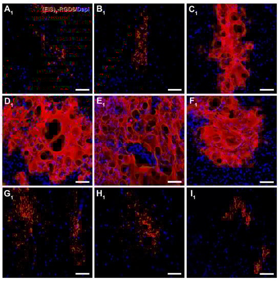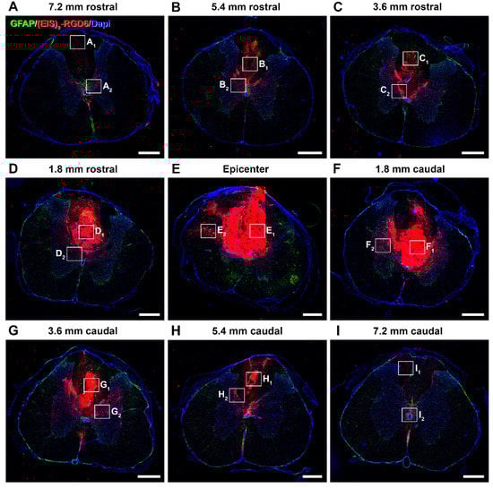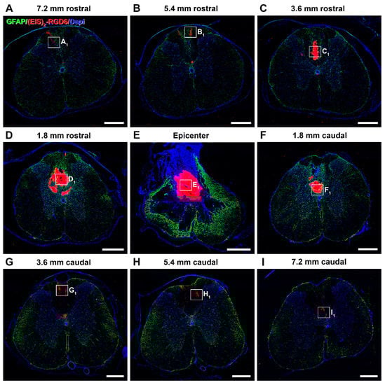 Qualitative microscopic analysis of (EIS)2-RGD6 structure at 42 days post-injury. Representative higher magnification images of spinal cord sections processed for the visualization of biotinylated (EIS)2-RGD6 at 42 days post-injury [experiment (EIS)2-RGD6 II], showing (EIS)2-RGD6 structure at the following representative rostro-caudal spinal cord levels: (A1) 7.2 mm rostral; (B1) 5.4 mm rostral; (C1) 3.6 mm rostral; (D1) 1.8 mm rostral; (E1) 0 mm; (F1) 1.8 mm caudal; (G1) 3.6 mm caudal; (H1) 5.4 mm caudal; and (I1) 7.2 mm caudal from the injury epicentre. Scale bars, 50 µm. Please note that the specific areas shown in these images are highlighted in Figure 10.