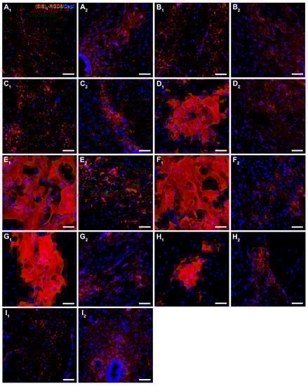 Qualitative microscopic analysis of (EIS)2-RGD6 structure at 1 day post-injury. Representative higher magnification images of spinal cord sections processed for the visualization of biotinylated (EIS)2-RGD6 at 1 day post-injury [experiment (EIS)2-RGD6 II], showing (EIS)2-RGD6 structure at the following representative rostro-caudal spinal cord levels: (A1,A2) 7.2 mm rostral; (B1,B2) 5.4 mm rostral; (C1,C2) 3.6 mm rostral; (D1,D2) 1.8 mm rostral; (E1,E2) 0 mm; (F1,F2) 1.8 mm caudal; (G1,G2) 3.6 mm caudal; (H1,H2) 5.4 mm caudal; and (I1,I2) 7.2 mm caudal from the injury epicentre. Scale bars, 50 µm. Please note that the specific areas shown in these images are highlighted in Figure 9.