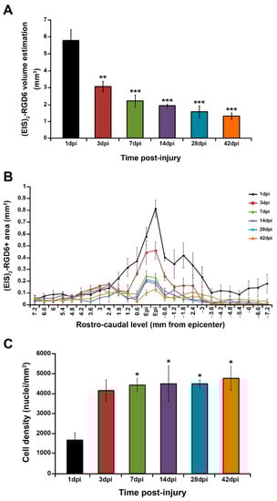 Quantitative analysis of (EIS)2-RGD6 degradation and cell infiltration. Graphs show data obtained from the quantification of biotinylated (EIS)2-RGD6 degradation and cell infiltration [experiment (EIS)2-RGD6 II] at 1, 3, 7, 14, 28, and 42 days post-injury (dpi): (A) data obtained from quantification of the temporal evolution of (EIS)2-RGD6 estimated total volume (**, p < 0.01 and ***, p < 0.001 vs. 1 dpi); (B) data obtained from the quantification of the temporal evolution of (EIS)2-RGD6+ area at each evaluated rostro-caudal level; and (C) data obtained from the temporal evolution of cell density in the (EIS)2-RGD6 porous scaffold in the lesion epicentre (*, p < 0.05 vs. 1 dpi). In (A,C), the potential existence of statistically significant between-group differences was assessed by one-way ANOVA followed by the Bonferroni post-hoc test.