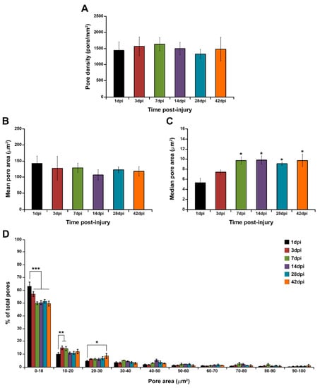 Quantification of the degree of porosity of the (EIS)2-RGD6 porous scaffold indicated no differences in pore density during the temporal progression of the injury (Figure 14A). Regarding pore size, at all evaluated times post-injury, the mean pore area was in the range of 110–150 µm2, without significant variations (Figure 14B); however, when the median pore area was evaluated, a significant increase in this parameter was observed from 1 to 7 dpi, while no differences were found from 7 to 42 dpi (Figure 14C). Finally, analysis of the pore size distribution showed a wide range of pore areas, although approximately 90% of pores displayed an area between 1 and 100 µm2 (Figure 14D). Moreover—and accordingly to that observed in the median pore size analysis—we found a slight augmentation in pore size with increasing time post-injury; although, in general, the pore size distribution remained highly stable over the evaluated time period (Figure 14D).