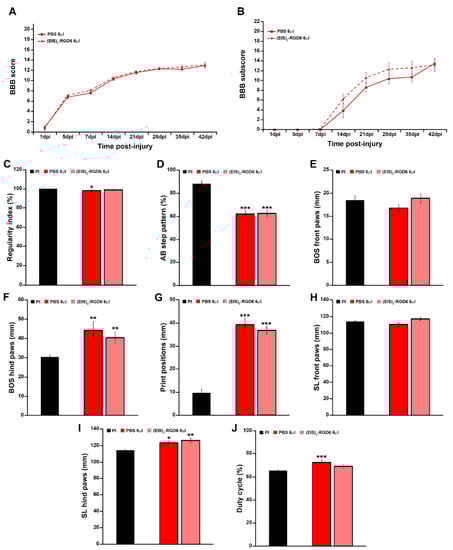 Evaluation of the effects exerted by (EIS)2-RGD6 injection in motor functional recovery. Graphs show data obtained from the evaluation of the effects exerted by (EIS)2-RGD6 injection in motor functional recovery in animals used to perform the experiment (EIS)2-RGD6 III. (A) Data from motor functional recovery assessment using the 21-point Basso, Beattie, and Bresnahan open-field test (BBB) score at 1, 5, 7, 14, 1, 28, 35, and 42 days post-injury (dpi); (B) data from motor functional recovery evaluation using the BBB sub-score at the same times post-injury; and (C–J) data from motor functional recovery assessment at 42 dpi using the Catwalk® gait analysis system. The following gait parameters were evaluated: (C) regularity index [*, p < 0.05 vs. pre-injury (PI)]; (D) AB step pattern (***, p < 0.001 vs. PI); (E) front paws base of support (BOS); (F) hind paws BOS (**, p < 0.01 vs. PI); (G) print positions (***, p < 0.001 vs. PI); (H) front paws stride length (SL); (I) hind paws SL (*, p < 0.05 and **, p < 0.01 vs. PI); and (J) duty cycle (***, p < 0.001 vs. PI). In (A,B), the potential existence of statistically significant between-group differences was assessed by two-way ANOVA followed by the Bonferroni post-hoc test while, for (C–J), one-way ANOVA followed by the Bonferroni post-hoc test was conducted. Please note that data obtained from the separate analysis of the individual BBB parameters evaluated can be found in Table S3.