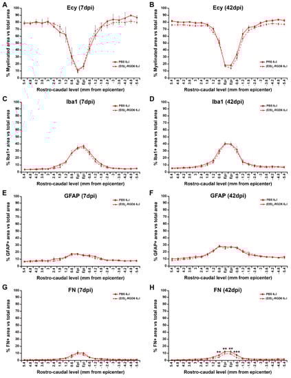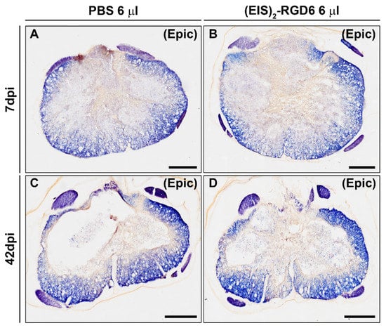 Finally, a third experimental set [experiment (EIS)2-RGD6 III] was carried out for deeper evaluation of the effects exerted by (EIS)2-RGD6 injection in motor functional recovery and various associated histopathological processes after SCI (myelin preservation, fibrosis, and astroglial and microglia/macrophage reactivity). Specifically, a total of 30 rats were sub-divided into the following experimental groups: (1) Group PBS 6 µL, composed of lesioned rats injected with PBS, which were sacrificed at 7 (n = 4) and 42 dpi (n = 9); and (2) Group (EIS)2-RGD6 6 µL, composed of lesioned rats injected with (EIS)2-RGD6, which were sacrificed at 7 (n = 6) and 42 dpi (n = 11). As previously stated, 6 µL of PBS or (EIS)2-RGD6 were injected into one injection point at 0 mm from epicentre, 0 mm lateral, and 1 mm depth in all animals in this experimental set.