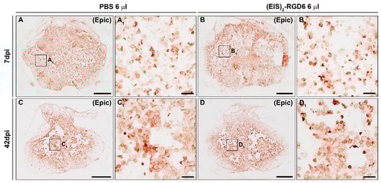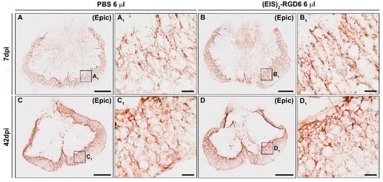 Regarding (EIS)2-RGD6 distribution, qualitative microscopic analysis of spinal cord sections processed for the visualization of (EIS)2-RGD6 demonstrated that, at all evaluated time points, (EIS)2-RGD6 was detected at all analysed rostro-caudal levels (from 7.2 mm rostral to 7.2 mm caudal to the lesion epicentre). Notably, the presence of (EIS)2-RGD6 showed an evident correlation with the lesioned areas at all analysed times post-SCI, as (EIS)2-RGD6 accumulation was higher in spinal cord sections corresponding to the lesion epicentre (point of injection) and at adjacent rostro-caudal levels, where (EIS)2-RGD6 was prominently observed in the centre of the lesion, compared to what was detected at rostro-caudal levels separated from the injury site, where (EIS)2-RGD6 was mainly found in the lesioned dorsal columns, in grey matter areas contacting them, and surrounding the central canal. Finally, an evident qualitative decrease in the presence of (EIS)2-RGD6 was observed from 1 to 7 dpi (mainly in the lesion epicentre and at the adjacent spinal cord levels), which was less obvious from 7 to 42 dpi. Representative images showing (EIS)2-RGD6 distribution in the lesioned spinal cord are shown in Figure 9 (1 dpi), Figure S2 (3 dpi), Figure S3 (7 dpi), Figure S4 (14 dpi), Figure S5 (28 dpi), and Figure 10 (42 dpi); while higher magnification images corresponding to the areas highlighted with squares in the previously detailed figures and supplementary files can be found in Figure 11 (1 dpi), Figure S6 (3 dpi), Figure S7 (7 dpi), Figure S8 (14 dpi), Figure S9 (28 dpi), and Figure 12 (42dpi), respectively.