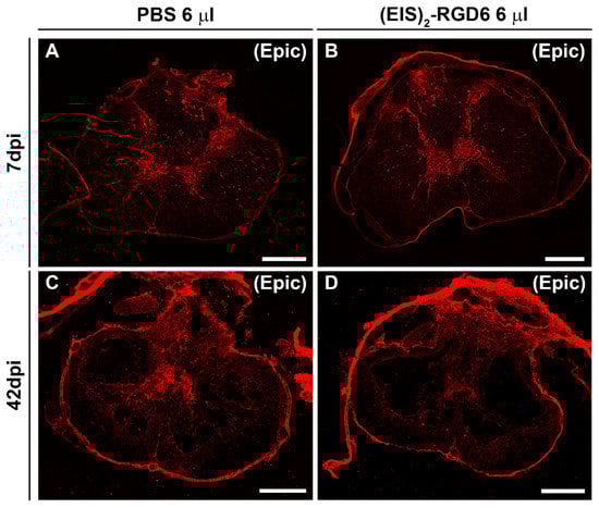 To evaluate fibrosis in animals used to perform experiment (EIS)2-RGD6 III, one set of parallel spinal cord sections per animal was processed for the visualization of fibronectin (FN). To this end, we used the same fluorescence-based simple immunohistochemistry protocol that we have described in previous reports [57,59,61]. The following primary and secondary antibodies were used: polyclonal rabbit anti-FN (F3648, Sigma-Aldrich, Steinheim, Germany; 1:500) and Dylight594-linked goat anti-rabbit (ab96897, Abcam, Cambridge, UK). Again, sections processed without the primary antibody were used as controls, in order to confirm a lack of undesired cross-reactivity.