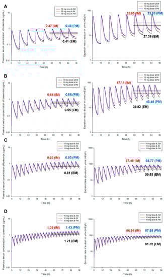 Simulation of plasma (or serum) torsemide concentration (left) and urinary sodium excretion rate (right) following oral multiple exposures at (A) 12, (B) 8, (C) 6, and (D) 4 h dosing intervals of 10 mg torsemide (according to different CYP2C9 phenotypes in healthy adult populations). The line presented parallel to the X-axis means values in the steady state.