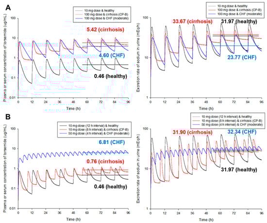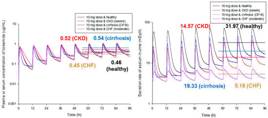 Simulation of plasma (or serum) torsemide concentration (left) and urinary sodium excretion rate (right) according to (A) administration dose and (B) frequency of torsemide multiple oral exposures in healthy adults, cirrhosis patients, and CHF patients. The line presented parallel to the X-axis means values in the steady-state.