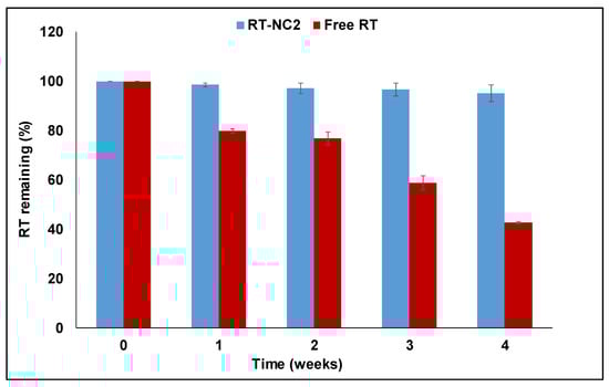 Concerning RT photostability, previous studies have shown that RT is susceptible to photodegradation where exposure to UVB radiation for 120 min resulted in a decrease of 13.6% in RT content [52]. Our results show that light exposure caused progressive degradation of free RT (Figure 1). Thus, after 4 weeks of light exposure, only 42.7 ± 0.7% was remaining for free RT. In contrast, RT-NC2 had much better stability against light exposure. For instance, after the same time, the remaining RT for the nanocrystals was 95.1 ± 3.4%. This confirms that the nanocrystals stabilized by HP-β-CD had around 2.3-fold better RT photostability. This much better stability for the nanocrystals might be attributed to the protection effect offered by HP-β-CD where it covers the drug nanocrystals. These results are in agreement with previous reports showing better photostability of RT when formulated into nanoparticles [53].