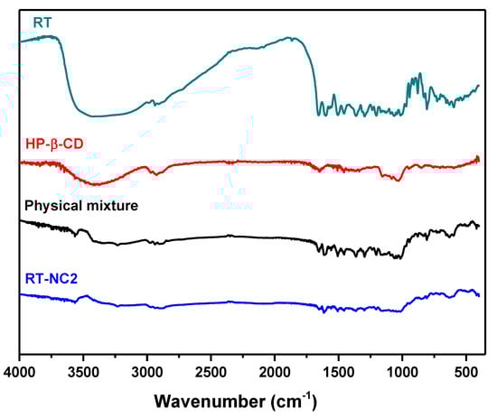 The FT-IR spectra of RT alone, HP-β-CD alone, their physical mixture (1:1, w/w), and selected RT–nanocrystal formulation (RT-NC2) were recorded using a Shimadzu IR-470 spectrophotometer (Shimadzu, Seisakusho Ltd., Kyoto, Japan) at a wavenumber range of 4000–400 cm−1. The potassium bromide (KBr) disc method was used. The samples were ground, mixed thoroughly with KBr, and compressed into discs using an IR compression machine.
