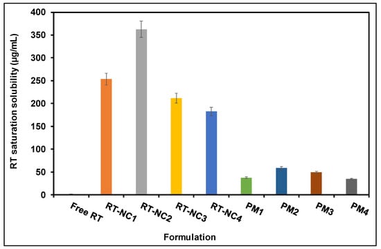 RT is a hydrophobic compound with poor aqueous solubility which limits its bioavailability and clinical benefits [55,56]. The results obtained (Figure 3) show that RT solubility in phosphate buffer pH 6.5 was 1.8 ± 0.7 µg/mL. Rutin is a weak acid with pKa in the range of 7.1 to 11.65 leading to a pH-dependent solubility profile [57]. Conversion of RT into NCs resulted in a significant increase in its aqueous solubility for all the tested stabilizers (Figure 3) (p < 0.05). For instance, NCs showed around a 102- to 202-fold increase in RT aqueous solubility that was dependent on the type of the stabilizer. The degree of solubility enhancement followed this descending order: HP-β-CD (RT-NC2) > Pluronic F127 (RT-NC1) > Tween 80 (RT-NC3) > PEG 6000 (RT-NC4). This might be related to the nanocrystal particle size where HP-β-CD-stabilized nanocrystals had the smallest particle size of 270.5 ± 16.7 nm among the tested stabilizers (Table 2). According to the Ostwald–Freundlich equation, the decrease in particle size results in increasing the particles’ surface area which in turn leads to increasing rutin’s aqueous solubility [58,59]. However, particle size is not the only factor influencing aqueous solubility. For example, Tween 80-stabilized nanocrystals had a bigger size than those stabilized by PEG 6000 but they had better solubility (Table 2). This is presumably attributed to the ability of Tween 80 to form micelles that encapsulate hydrophobic drugs such as rutin and increase their aqueous solubility [41,49].