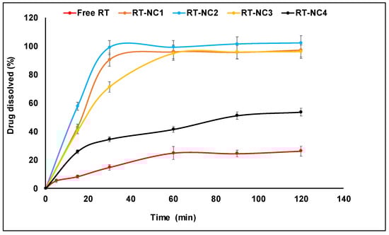 Dissolution profiles of various RT-NCs in phosphate buffer pH 6.5 at 37 °C in comparison to free RT.