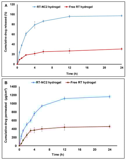 Figure 6A shows that drug release from the free drug hydrogel was slow whereby around only 30% of the drug was released after 24 h. This is presumably due to the hydrophobic nature of the drug which limits its dissolution rate and aqueous solubility. Release of a drug suspended in a hydrogel base is believed to include two steps: drug dissolution followed by diffusion of the solubilized drug through the hydrogel matrix. In contrast, a much faster drug release was observed for RT-NC2 hydrogel whereby almost complete drug release (~97%) was observed in 12 h. These results agree well with the enhanced dissolution rate and aqueous solubility described above for RT nanocrystals in comparison to the free drug. Similar behavior was also observed previously for nanocrystals suspended in a hydrogel base and was attributed to the small particle size of the nanocrystals leading to larger surface area and smaller diffusion distance and, hence, better drug dissolution and release [67]. The drug release medium was also reported to influence the drug release rate from nanocrystal formulations [42]. For instance, the pH of the release medium was found to affect the ionization status of ionic drugs leading to an important influence on their dissolution and release rate. Moreover, stabilizers that increase the release medium viscosity in the vicinity of a nanocrystal surface decreased the drug release rate from nanocrystal formulations [42].