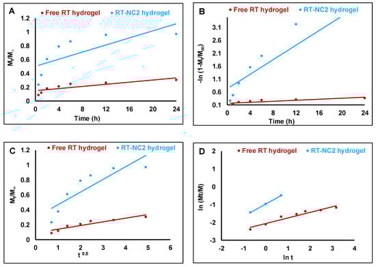 The release of RT from free RT and RT-NC2 hydrogels was characterized using the dialysis method through a semi-permeable cellophane membrane (molecular weight cutoff 12,000–14,000, Sigma Aldrich, St. Louis, MO, USA) as mentioned previously with slight modification [35]. Briefly, the tested formulation (1 g of hydrogel equivalent to 5 mg RT) was placed over a previously soaked cellophane membrane fitted at the bottom of a glass tube open at both sides. The glass tube was immersed in a beaker containing 100 mL of phosphate buffer pH 6.5 with 0.25%, v/v ethanol. The beakers were placed in a thermostatically controlled shaking water bath, (DAIHAN Scientific Co., Seoul, South Korea) operating at 50 RPM and 37 ± 0.5 °C. Aliquots of 5 mL were withdrawn at intervals of 0.5, 1, 2, 4, 6, 12, and 24 h. The withdrawn samples were immediately replaced by equal volumes of the same medium. The drug content of the release samples was estimated spectrophotometrically at λmax of 359 nm. The experiments were performed in triplicate.