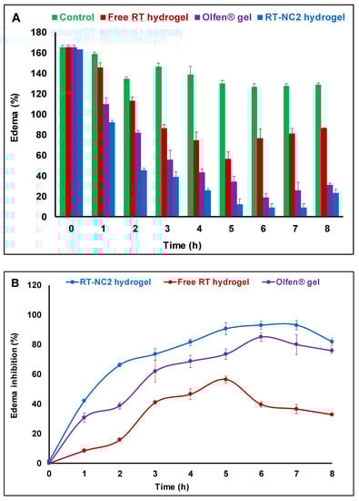 The carrageenan-induced rat paw edema inflammatory model was used to assess the potential of HP-β-CD-stabilized RT-NCs hydrogel to enhance RT’s anti-inflammatory properties in comparison to untreated control, free RT hydrogel and diclofenac sodium commercial gel (Olfen® gel) as a standard anti-inflammatory drug. The treatment was initiated 30 min post carrageenan injection and the percent edema was calculated (Figure 8A). The percent edema was highest at zero time for all of the tested preparations. Subsequently, there was a gradual decrease in the percent edema for all of the tested preparations. At any given time point, the percent edema followed this order: Control > free RT hydrogel > Olfen® (diclofenac sodium) commercial gel > RT-NC2 hydrogel. All the differences were statistically significant (p < 0.05).