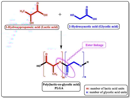 Schematic representation of chemical structure for PLGA and its monomers. Due to the presence of ester linkages that are degraded by hydrolysis in aqueous environments.