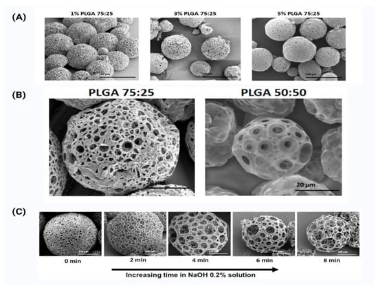 The figure shows different scanning electron microscope (SEM) images of poly(lactic-acid (PLGA) materials. (A) PLGA porous microsphere made by batch synthesis with increasing PLGA 75:25 concentrations (%w/v), 1%, 3%, and 5%. (B) SEM images representing the morphology of porous and non-porous microspheres obtained with PLGA polymers and MWT using PLGA 75:25, PLGA 50:50. (C) SEM images of 3% (w/v) PLGA 75:25 porous microspheres taken by the microfluidic technique at increasing soaking time in NaOH 0.2% solution. As immersion time increased, a more porous structure was obtained. This figure is adapted from [30].