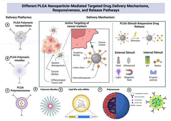 The images depict different PLGA polymer-based carriers that have been fabricated over recent years with the most important types used especially for targeting cancer (Figures (A–F)). Also, Figure (G) shows how PLGA amphiphilic block copolymers looks when loading with different anticancer drugs and/or DNA or RNA and decorated with small molecules receptor ligands or monoclonal antibodies for active targeting. The active targeting of cancer utilizing PLGA functionalization with different cancer markers makes them one of the most promising platforms for both treatment and diagnostics. The PLGA stimuli responsive release could be external or internal stimuli. The figure was created with BioRender.com.