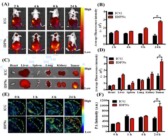(A) Time-dependent in vivo whole-body near-infrared (NIR) fluorescence (FL) imaging of EMT-6 tumor-bearing BALB/c nude mice 2, 4, 8, and 24 h following i.v. administration of free ICG and IDPNs. Tumors are blue circles. The color bar gradually changes from red to yellow as fluorescence signal intensity increases. (B) Quantification of average fluorescence signals in tumor sites in part A. * p < 0.05. (C) The color bar gradually changes from red to yellow as fluorescence signal intensity increases. (D) Quantification of part C’s isolated organs and tumors’ average fluorescence signals. * p < 0.05. (E) Time-dependent in vivo photoacoustic (PA) imaging of EMT-6 tumors in BALB/c nude mice 0, 1, 4, and 24 h following i.v. administration of free ICG and IDPNs. Tumor locations are indicated by cycles. The color bar gradually changes from blue to red as PA intensity rises. (F) PA intensity quantification in part E tumor locations. * p < 0.05. The figure is adapted from [99] with copyright permission.
