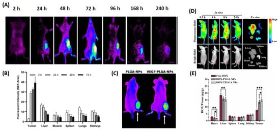 The figure represents different applications of PLGA. (A) Optical photographs taken of the entire mouse after 2, 24, 48, 72, 96, 168, and 240 h after subcutaneous injection of 500 µg of fluorescent PLGA-NPs in the right flank in a syngeneic tumor-bearing mouse. (B) Analyzing the PLGA-NPs’ biodistribution in BALB/c mice. This data is shown as the mean fluorescence (NET/Area) ±SD from 5 different mice at each time point. (C) Images of two syngeneic J744a-carrying mice. 1 tumor located in the right thigh, obtained 24 h post-injection (p.i.) of either native PLGA-NPs (left) or VEGF-PLGA-NPs (right). (D) TPLGA NP biodistribution in vivo. 24 h post-injection ex vivo fluorescent pictures of key organs and 4T1 tumors were observed. Red circles indicate tumor locations. Fluorescence intensity decreases from red to blue. (E) Tumor and major organ DOX content was determined 24 h after tail-vein injection with free DOX and DOX-loaded NPs. Mean ± SD (n = 3) was used. * p < 0.05, ** p < 0.01, and *** p < 0.001. Figure (A–C) is reproduced from [101] and Figure (D,E) are adapted from [96] with copyright permission.