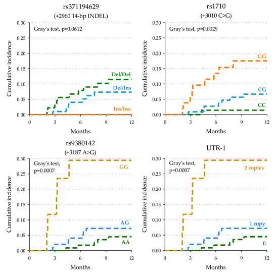 Regarding the impact of HLA-G 3′UTR polymorphisms on CR (Table 3), the rs371194629 (+2960)-Ins allele was associated with a lack of clinical response (HR of CR = 0.29, 95%CI: 0.10–0.82, pBH = 0.0336), with no Ins/Ins patients achieving CR versus a 12-month cumulative incidence of 11.5% in Del/Del patients (Figure 1). The presence of rs1710 (+3010)-G (HR = 4.58, 95%CI: 1.65–12.72, pBH = 0.0245) and rs9380142 (+3187)-G (HR = 3.18, 95%CI: 1.25–8.08, pBH = 0.0336) alleles resulted as a predictive factor for an increased chance of achieving complete response according to additive models (Table 3). Cumulative incidence according to these polymorphisms is shown in Figure 1.