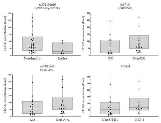 Plasma levels of sHLA-G according to the HLA-G 3′UTR genotypes related to the main HLA-G 3′UTR polymorphisms. The line represents the median value of sHLA-G levels, the grey box the 1st and 3rd quartile values in all the 35 plasma samples analyzed. The group name for rs371194629 refers to patients with Ins/Ins genotype (Ins/Ins) or Ins/Del and Del/Del genotypes (Non-Ins/Ins); for rs1710 to patients with C/C genotype (C/C) or C/G and G/G genotypes (Non-C/C); for rs9380142 to patients with A/A genotype (A/A) or A/G and G/G genotypes (Non-A/A); for UTR-1 haplotype to patients with almost one UTR-1 haplotype (UTR-1) or absence of UTR-1 haplotype (Non-UTR-1).