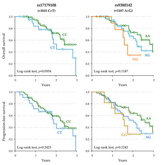 A homogeneous subgroup of 102 patients who responded to FOLFIRI chemotherapy was also analyzed for survival outcomes. In this subgroup, which achieved complete or partial response as the best tumor response, rs17179108 (+3035)-T and rs9380142 (+3187)-G alleles were associated with worse OS according to an additive model (HR = 2.37, 95%CI: 1.12–5.01, and HR = 1.95, 95%CI: 1.05–3.61, respectively), though not significant after accounting for multiple testing (pBH = 0.1173—Table 4, Figure 3). The same detrimental, statistically non-significant trend was observed for PFS (Table 4). Univariate associations are reported in Supplementary Table S4.
