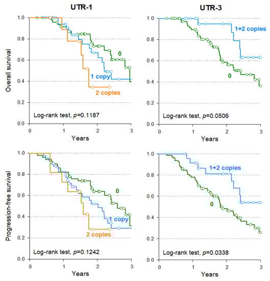 In this subgroup analysis, rs9380142 (+3187) (G allele) is a tagging SNP for the UTR-1 haplotype, and accordingly, the presence of UTR-1/UTR-1 diplotype was associated with a worse OS (HR = 4.16, 95%CI: 1.17–14.8, p = 0.0280) and a non-significantly worse PFS (HR:2.16, 95%CI: 0.81–5.80, p = 0.1258) compared to patients who did not carry a UTR-1 allele. Thus, the effect observed for the UTR-1 haplotype on OS appears to be mainly due to the rs9380142 (+3187) (G allele). All these associations lost their statistical significance after accounting for multiple testing. The T allele of rs17179108 (+3035) characterizes the UTR-5 and UTR-7 haplotypes, which have a low frequency in our population (<10%). The presence of at least one copy of the UTR-7 haplotype, including the rs17179101 (+3027)-A (tagging SNP for the UTR-7 haplotype) and the rs17179108 (+3035)-T alleles, and the presence of at least one copy of the UTR-5 haplotype, including the rs17179108 (+3035)-T allele but not the rs17179101 (+3027)-A allele, seems to suggest only the unfavorable effect on OS and PFS. Contrariwise, the presence of at least one copy of the UTR-3 haplotype (all wild-type alleles) showed better OS (HR = 0.25, 95%CI: 0.08–0.75, p = 0.0135) and also longer PFS (HR = 0.35, 95%CI: 0.15–0.80, p = 0.0129) in multivariate analysis, although the significance was not confirmed after accounting for multiple testing. The Kaplan–Meier curve shows the trend for OS and PFS (Figure 4).