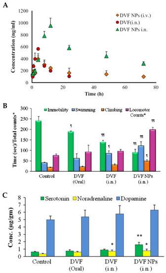 (A)—Desvenlafaxine brain concentration after intranasal administration of a drug solution (DVF (i.n.)) or the developed nanoparticles (DVF NPs i.n.), or the intravenous administration of the nanoparticles (DVF NPs (i.v.)); (B)—Evaluation of the antidepressant activity of intranasal desvenlafaxine nanoparticles (DVF NPs (i.n.)), intranasal desvenlafaxine solution (DVF (i.n.)) and oral desvenlafaxine solution (DVF (Oral)), in chronically depressed rats; (C)—Effect of intranasal desvenlafaxine nanoparticles (DVF NPs (i.n.)), intranasal desvenlafaxine solution (DVF (i.n.)) and oral desvenlafaxine solution (DVF (Oral)) on neurotransmitter levels in rat brain; ¶ and * represent p < 0.05, ¶¶ and ** represent p < 0.01; Conc.—concentration; DVF—desvenlafaxine; NPs—nanoparticles; adapted from Tong et al. [61], reproduced with permission from Elsevier [License Number 5426000412295].