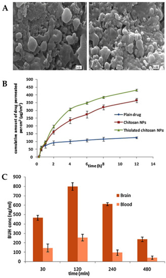 (A)—Scanning electron microscope images of the buspirone chitosan nanoparticles (on the left (2.c.(i))) and thiolated chitosan nanoparticles (on the right (2.c.(ii))); (B)—Ex vivo permeation study of buspirone chitosan nanoparticles (Chitosan NPs), thiolated chitosan nanoparticles (Thiolated chitosan NPs), and drug solution (Plain drug); (C)—Buspirone brain and blood concentrations after intranasal administration of the thiolated chitosan nanoparticles; BUH—buspirone; conc—concentration; NPs—nanoparticles; adapted from Bari et al. [64], reproduced with permission from Elsevier [License Number 5426000697685].