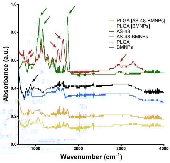 FTIR spectrum collected in the range between 600 and 4000 cm−1. The black arrow stands for adsorption bands associated with magnetite (lines in black), AS48 distinctive adsorption bands are marked with red arrows and those for PLGA are marked with green arrows.