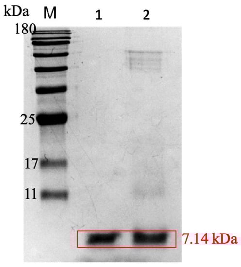 SDS-PAGE gel of the nano-formulation. Other than the marker (M), purified AS-48 (Lane 1) and PLGA[AS-48-BMNPs] (Lane 2) were loaded in the second and third lanes, respectively.
