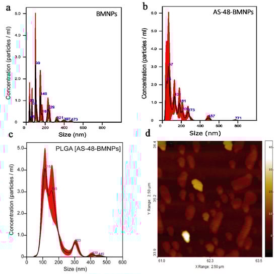 NTA size distribution of (a) BMNPs, (b) AS-48-BMNPs, and (c) PLGA[AS-48-BMNPs]. (d) AFM analysis of PLGA[AS-48-BMNPs].