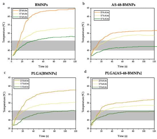 Time evolution of the temperature increase caused by (a) BMNPS, (b) AS-48-BMNPs, (c) PLGA[BMNPs], and (d) PLGA[AS-48-BMNPs] following exposure to AMF of different magnetic field strengths (13, 17, 23 kA/m) at a fixed frequency of 120 kHz. The transparent grey band shows the therapeutic temperature.