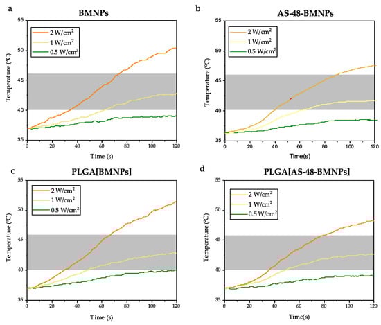Time evolution of the temperature increase caused by (a) BMNPS, (b) AS-48-BMNPs, (c) PLGA[BMNPs], and (d) PLGA[AS-48-BMNPs] following exposure to different laser power densities (0.5, 1, 2 W/cm2). The transparent grey band shows the therapeutic temperature.