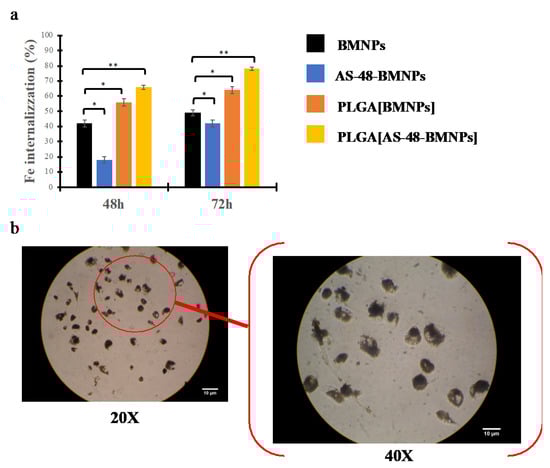 (a) Quantitative analysis of BMNPs by measuring the Fe content inside the macrophages after 48 and 72 h in TH1-P cell line following treatment with BMNPs (229 μg/mL), AS-48-BMNPs (229 μg/mL BMNPs and 32 μg/mL AS-48), PLGA[BMNPs] (457 μg/mL PLGA, 229 μg/mL BMNPs), PLGA[AS-48-BMNPs] (457 μg/mL PLGA, 229 μg/mL BMNPs and 32 μg/mL AS-48). (b) Brightfield microscopy of THP-1 cells treated 72 h with PLGA[AS-48-BMNPs] * p ≤ 0.05, ** p ≤ 0.001.