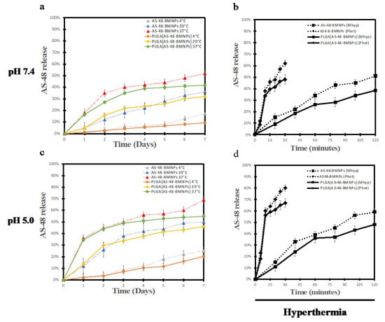 AS-48 released data from PLGA[AS-48-BMNPs] and AS-48-BMNPs in PBS pH 7.2–7.4 (a) and in citrate pH 5.0 (c) at different temperatures (4, 20, and 37 °C). AS-48 released data from the same nano-formulations following magnetic hyperthermia (Mhyp) and photothermia (Phot) applied for 120 and 30 min, respectively, at pH 7.2–7.4 (b) and pH 4.5–5.0 (d).