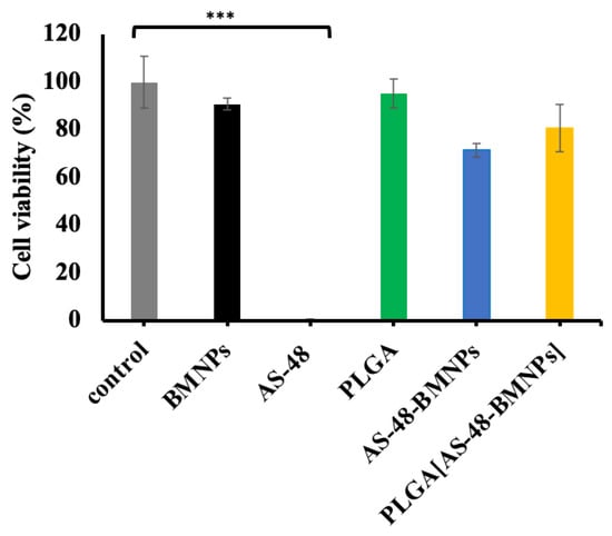 Viability assay in TH1-P cell line following treatment with culture medium (control), BMNPs (229 μg/mL), AS-48 (32 μg/mL), PLGA (457 μg/mL), AS-48-BMNPs (229 μg/mL BMNPs and 32 μg/mL AS-48), PLGA[AS-48-BMNPs] (457 μg/mL PLGA, 229 μg/mL BMNPs and 32 μg/mL AS-48). *** p ≤ 0.0001 when compared to control values.
