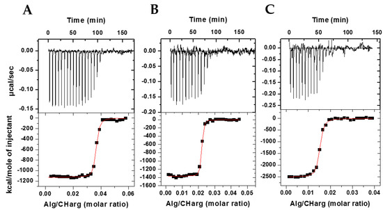 Figure 1 shows in the upper panels the heat peaks released with each addition of alginate solution to CHarg and JM72 solution. It is evident that negative enthalpy variation occurs in an exothermic process that gradually decreases in intensity with each addition, until when there are no more interaction sites available between the oppositely charged polyelectrolytes.