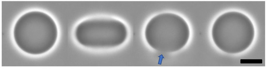 Phase contrast microscopy snapshots showing sequence of electroporation of POPC GUVs in polypeptide–bioparticle solution with deformation produced by electric pulse, pore formation indicated by arrow and final recovery of the spherical shape. All process occurs in less than 100 ms. Bar expands 20 μm for all.